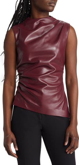 Sleek faux leather elevates this sleeveless funnel-neck top designed with rippled ruching and an angled hem.