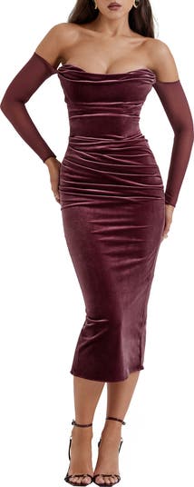 Delicate, sheer sleeves frame this shapely shoulder-baring midi topped with a corset-like bodice and textured in sumptuous stretch velvet and rippled ruching.