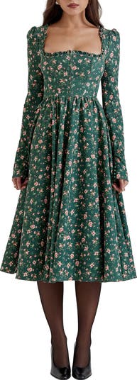 Long sleeves and puffed shoulders frame this pretty midi dress designed with a voluminous skirt.