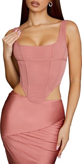 A powermesh lining brings sculpted appeal to this edgy corset.