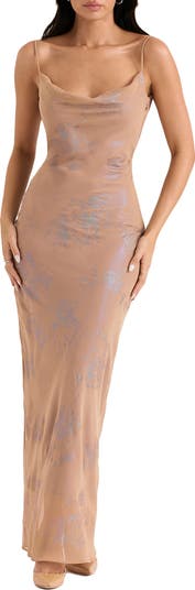 Channel effortless elegance at your next special event in this metallic satin gown that fluidly flaunts your figure with clingy fabric and a drapey cowl neck.