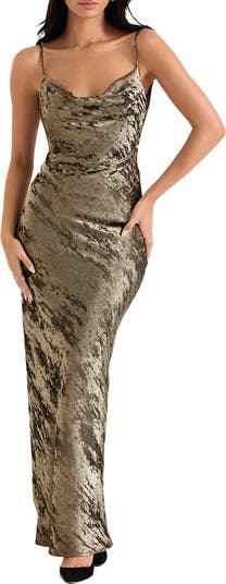 Channel effortless elegance at your next special event in this metallic satin gown that fluidly flaunts your figure with clingy fabric and a drapey cowl neck.