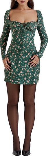 Long sleeves and puffed shoulders frame this pretty minidress designed with a signature corset-inspired bodice with supportive boning.