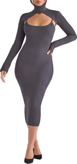 A bolero with long bell sleeves warms this curve-hugging dress with ribbed texturing and a square neck.