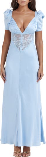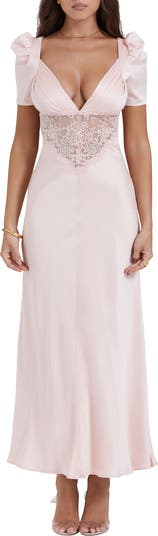 A lacy inset lends romance to this puff-sleeve cocktail dress made of smooth, stretchy silk blend.