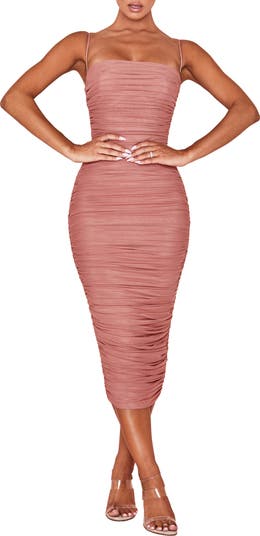 A gorgeous mesh dress has a ruched overlay and features the brand's signature powermesh lining for a curvaceous silhouette.