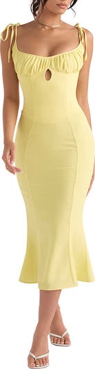 From the cutout design to the ruched trim on the neckline to the subtle flare of the mermaid silhouette, this sunny-day midi is all about the details.