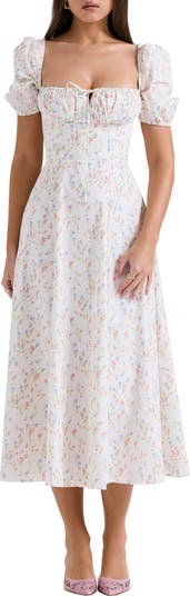 Freshen up your garden-party style in a stretch-poplin midi dress with puff sleeves, corsetry boning and a thigh-baring slit for a sweet, seductive vibe.