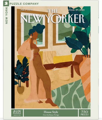 Transform your downtime into a stylish escape with the "House Style" 750-Piece Puzzle, featuring the March 29, 2021, cover of The New Yorker by acclaimed artist Reyna Noriega. This visually striking artwork captures a serene moment of self-reflection, depicting a confident woman standing gracefully in a chic, sunlit room adorned with rich greenery and modern décor. The vibrant earth tones and layered textures lend depth and sophistication, making the puzzle as beautiful to assemble as it is rewarding to complete.\r\n\r\nCrafted with 750 random die-cut pieces, this puzzle ensures a dynamic and engaging experience, with no two pieces alike. Proudly made in the USA, it reflects exceptional quality, combining premium materials with vibrant printing that highlights every detail of Noriega's contemporary design. The bold and modern aesthetic makes this puzzle a perfect choice for art lovers and fans of modern décor, while the completed piece is ideal for framing as a stunning display of elegance and style.\r\n\r\nImmerse yourself in the meditative process of piecing together this artistic masterpiece. Whether as a thoughtful gift or a creative challenge for yourself, the "House Style" puzzle effortlessly blends art, style, and fun into one captivating package.