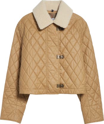 Built upon and from the Burberry archive of house codes, materials and construction techniques, the Howle quilted jacket is tailored in a cropped silhouette from cotton poplin treated to give it a distressed finish and is accented with check corduroy and finished with plush shearling on the collar.