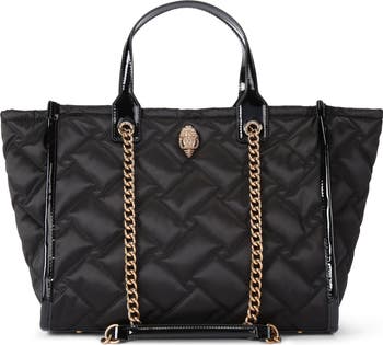 A signature crystal-encrusted eagle head highlights the multidirectional quilting on a scaled-down shopper bag partially made from recycled material and fitted with convertible carrying straps.