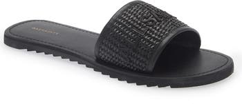 The sleek monochromatic look and woven strap of this slide sandal adds a touch of sophistication to your casual style.