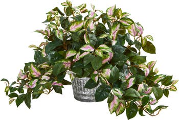 Pink and green hues are beautifully complemented in this artificial hoya hanging plant. Indistinguishable from the real thing with its realistically overgrowth of detailed leaves, this plant stands 16” tall from a vintage metal planter with a hook ready for hanging. Great for small spaces, you can easily hang it from any interior wall or corner.
