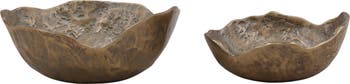 Crafted from aluminum and finished in rich Antique Brass, the Hudson Bowl Set evokes the look of hand-forged artifacts with organically shaped rims and deeply textured interiors. Sold as a set of two, the large bowl measures 12"W x 12"D x 5"H, while the smaller companion measures 9.5"W x 9.5"D x 4"Hperfect for layered styling on consoles, dining tables, or shelves. The antiqued finish creates natural variation in tone and surface pattern, ensuring each piece carries its own distinct character. Designed for decorative use, this sculptural duo brings collected depth and warmth to modern interiors.