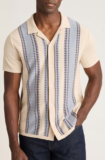 A natty notched collar completes the refined retro look of a short-sleeve cotton sweater knit with intricate patterned stripes flanking the placket.