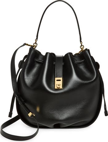 Ferragamo welcomes a bucket-bag addition to its Hug line with this everyday style secured with a golden Hug buckle and made from leather in a sumptuously gathered silhouette.