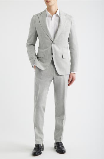 Chalky pinstripes subtly detail the cloudy-grey coloring of a suit made of cotton and virgin wool and designed with peaked lapels adding an old-school finish to the smartly tailored jacket. The flat-front trousers sit right at the waist and feature lightly tapered legs to blend traditional detailing with a modern profile.