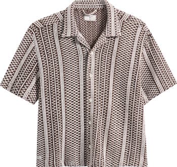 Tactile openwork stripes woven into the cotton-enriched fabric fabric make this camp shirt a getaway essential that'll see you stylishly from the pool deck to dinner at the resort.
