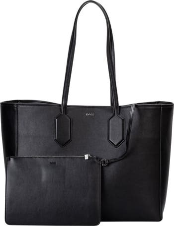 Gleaming logo hardware stands out against sleek faux leather on a slightly unstructured shopper bag designed with a spacious interior and removable pouch perfect for storing your daily essentials.