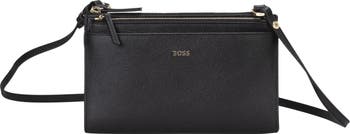 Gleaming logo hardware stands out against the richly textured leather of a compact crossbody bag furnished with multiple compartments for easy organization.