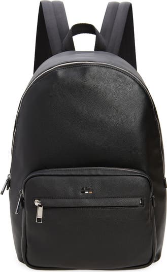 This minimalist backpack is a crafted from richly grained faux leather with adjustable straps and an exterior zip pocket.