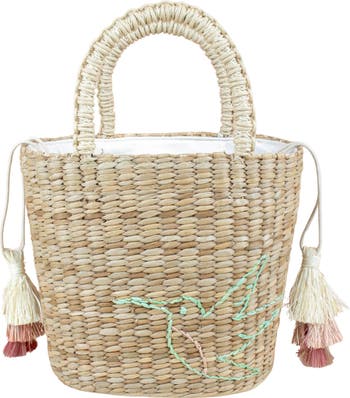 Handwoven by artisans from natural bangkuan fiber, this whimsical tote features a hand-stitched hummingbird and a canvas interior that secures with playful tassel ties. Slight variations in weave and color make each bag one of a kind.