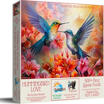 Discover the enchanting dance of hummingbirds in a floral paradise, made vibrant by the masterful artistic touch of John Stewart through the 500-piece Hummingbird Love Jigsaw Puzzle by SunsOut Puzzles. Measuring 19.25" x 26.625", this enticing piece of artwork comprises of perfectly crafted, interlocking pieces made from high-quality recycled cardboard, ensuring durability and a seamless fit minimizing frustrations and maximizing pleasure during assembly. SunsOut Puzzles goes beyond craftsmanship, offering a worry-free guarantee for any issues related to missing or damaged pieces and eco-friendly, sustainable practices. Using soy-based inks and premium recycled board designed for puzzles, SunsOut Puzzles support the environment while delivering top-notch, licensed artwork that you can feel good about indulging in. As a woman-owned business that produces its high-quality, intricately beautiful products proudly in the USA, the Hummingbird Love puzzle can also serve as a perfect gift to spread love for any occasion from Valentine's Day to holidays, or as an indulgent treat for yourself. Puzzle together with friends and family to create cherished memories while you celebrate love, nature, and artistry with every piece. With SunsOut Puzzles' commitment to superior quality and customer satisfaction, enjoy a remarkable puzzling experience that embraces the joy of puzzling today.
