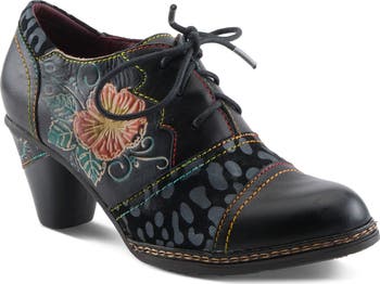 Boldly patterned paneling and floral debossing put an artisanal spin on this oxford-inspired pump lifted by a topstitched block heel.