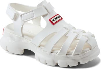A chunky lug sole grounds a lightweight sandal done in a water-friendly fisherman design perfect for their warm-weather explorations.