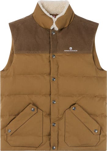 This puffy vest in recycled down and rugged waxed herringbone cotton offers premium warmth. The front of the garment features two patched hand-warming pockets, with a polar fleece-lined collar for ultimate comfort.
