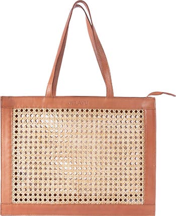 Smooth leather trim and finely woven rattan bring artisanal contrast to a structured tote secured with a top zipper and suspended from a pair of comfortable shoulder straps.