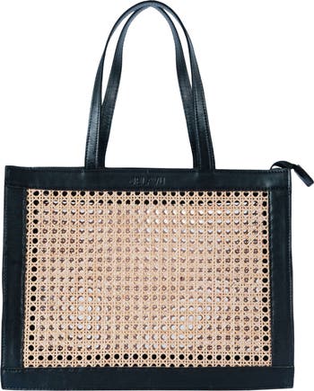 Smooth leather trim and finely woven rattan bring artisanal contrast to a structured tote secured with a top zipper and suspended from a pair of comfortable shoulder straps.