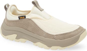 Teva's pull on shoe ( it is not SLIP-ON), is cushiony, and the Desert Taupe/Cloud Cream is a lovely color combination. I am able to remove the footbed, insert my new orthotics, and the fit is still good. I recommend for springing around town, but hold off on hiking in them.