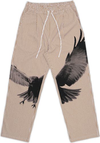 A soaring eagle spans the front and wraps around the legs of all-cotton drawstring pants that balance the shadowy bird with the verticals of crisp, textured pinstripes. They cinch above the hips with a relaxed fit in the seat and thighs and a slight taper to the hems to keep you comfortable whether you're nesting at home or out spreading your wings.