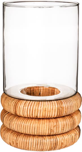 Bring versatile elegance to your decor with this 10-7/8"H Glass Hurricane Vase. Featuring a clear glass vessel nestled within a woven rattan base, this piece offers a harmonious blend of natural and contemporary styles. Perfect for holding water, it can showcase a pillar candle, decorative fillers, or even serve as a charming home for a beta fish. The rattan base's three-tiered design adds texture and warmth, while the clear glass provides a timeless, airy aesthetic. Ideal for tablescapes, mantels, or standalone displays, this hurricane vase combines beauty and practicality.