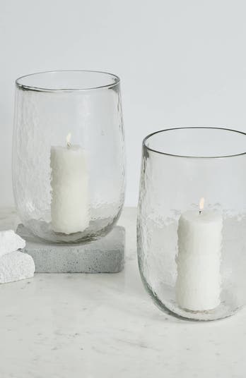 Just add a large pillar candle to this jumbo hurricane and you can instantly transform your environment, indoors or out. This rounded, oversize piece creates an elegant space for a burning candle to safely illuminate a room or patio for hours, with its softly dimpled surface reflecting the flame. Made by hand from recycled and new glass, each hurricane is an eye-catching creation. If not used for candles, the hurricane can serve as a terrarium, fish bowl, punch bowl, or centerpiece for floating blossoms or other collections.