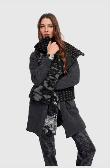 This cropped moto vest makes a bold statement with soft structure and graphic contrast. Crafted in brushed knit, it's fully reversible with two distinct looks in one. The oversized collar, deep armholes, and sculptural shape layer effortlessly over slim knits or flowing tops.