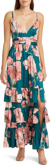 Get ready for wedding season in an ankle-grazing dress blooming with an oversized floral print and designed with tiered ruffles that sway with every move.