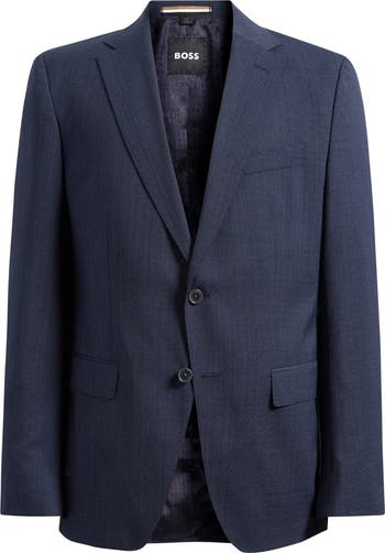 Premium virgin wool in a dark, dappled blue distinguishes a sport coat that's tailored in a slim profile with smartly padded shoulders and a fitted waist providing a classic silhouette. Traditional detailing and a partial lining make it a lightweight, comfortable choice for semiformal and between-season occasions.