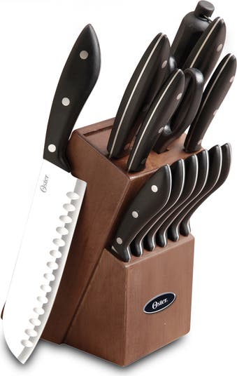 Complete your kitchen with the Huxford 14 piece knife set. Each blade is precision-stamped for durability through the full length of the knife. This Oster cutlery block set also features high-quality, stain and rust-resistant stainless steel blades. Keep your counters clutter free by storing your new knives safely and conveniently in the beautify Mahogany wood block.Features:* Stainless Steel* Rubber Wood Block* Triple Rivet Bakelite Handle* Hand wash recommended