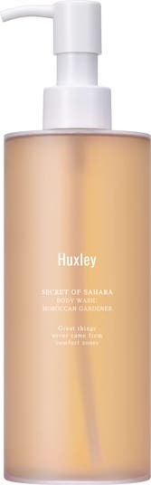 - Star ingredients include Sahara prickly pear cactus seed oil, hyaluronic acid, tea tree leaf water and hinoki cypress water for a clean and refreshing wash. Hypoallergenic and deeply moisturizing, Huxley Body Wash is suitable for all skin types. Enjoy a richer and longer-lasting scent by pairing Huxley Body Wash with Huxley Lotion and Oil.