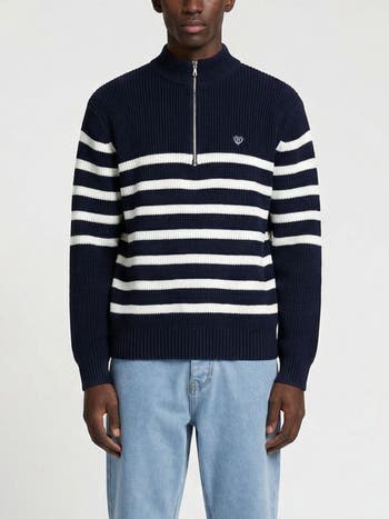 Cozy quarter zip sweater in a soft knit, delivering a relaxed silhouette and subtle stripe texture, perfect for weekend strolls or city evenings.