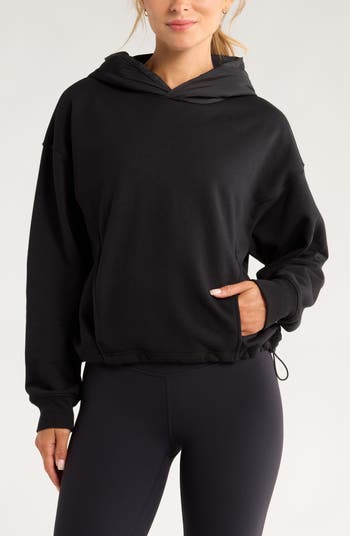 Channel off-duty athlete vibes in this mixed-media hoodie with roomy raglan sleeves, a cinchable drawcord waist and convenient pockets.