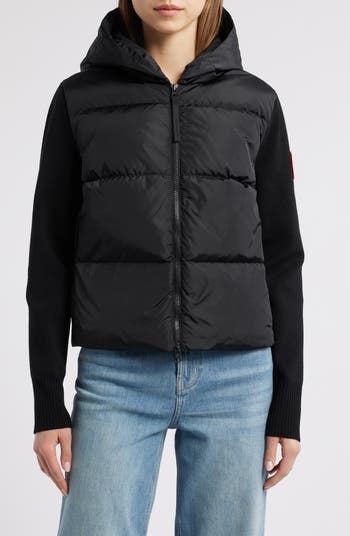 At either end of the snowy season, this hybrid jacket, designed with a down-filled body, roomy hood and woolly knit sleeves, will be the outerwear choice you make on repeat.