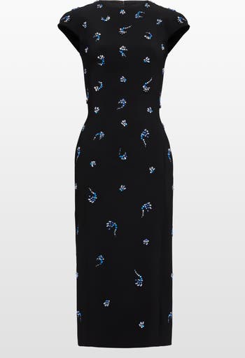 A modern take on classic elegance, this cocktail dress features a sleek silhouette adorned with delicately scattered crystal motifs for a refined touch of sparkle. Sculpted cap sleeves and precise tailoring enhance the feminine shape, offering a polished yet effortless look. Understated and versatile, its the perfect choice for cocktail parties, formal dinners, or elevated evening occasions.