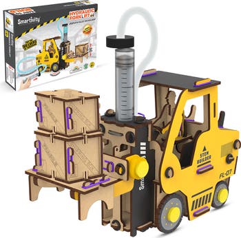 SMARTIVITY: HYDRAULIC FORKLIFT - Unleash the builder in your little one with the Smartivity Hydraulic Forklift – a toy that allows construction dreams to come to life! Dive into the world of construction with this hands-on STEM construction toy, empowering your child to craft their very own hydraulic-powered forklift, complete with a skilled driver, pallet, and cargo box. Say goodbye to screen time and hello to hours of immersive pretend play! Watch as your child discovers the fascinating world of hydraulics, unraveling the secrets behind the power of water molecules to lift and drop boxes. With easy assembly and endless fun, this STEM construction toy is a must-have for your kid's toy collection. Made from high quality sustainable wood. Get ready for an exciting addition to your child's creativity-filled playtime! This science toy is ideal for children aged 6 years and up, whether they’re working independently or with a helping hand from a parent or sibling.
