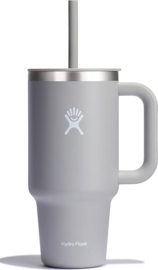 Stay hydrated on the go with this large, 32-ounce insulated travel tumbler that keeps drinks cold for up to 24 hours. The durable design features an ergonomic handle, a flexible straw and a splash-resistant Press-In Straw Lid for easy sipping. The sweat-free Color Last™ powder coating is colorful and comfortable to the touch.