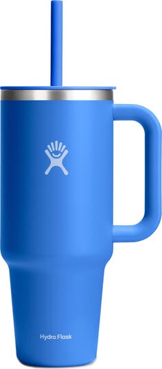 Stay hydrated on the go with this large, 40-ounce insulated travel tumbler that keeps drinks cold for up to 24 hours. The durable design features an ergonomic handle, a flexible straw and a splash-resistant Press-In Straw Lid for easy sipping. The sweat-free Color Last™ powder coating is colorful and comfortable to the touch.