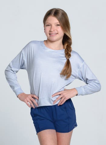 This girls round neck, drop shoulder, heather gray long sleeve is made from super lightweight polyester. The fabric is rated UPF 50+ for extra fun in the sun.