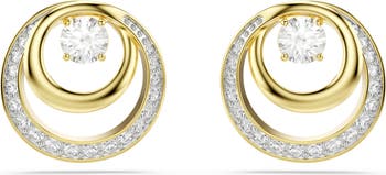 Bring some glinting movement to your look with these drop earrings that feature solid and pavé hoops around a central stone in a prong setting.